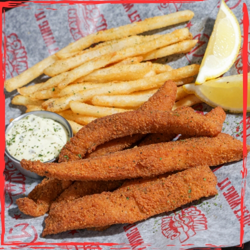 Tiras de pescado empanizado acompañado de papas a la francesa y aderezo tartara.