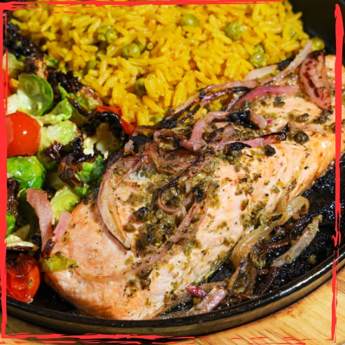 Salmon alcaparrado acompañado de arroz azafranado y col de bruselas con tomates cherry.
